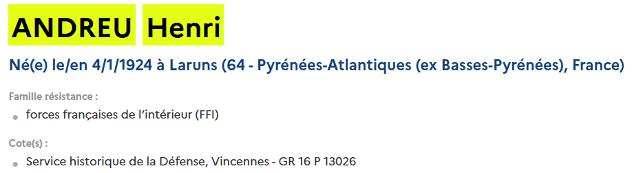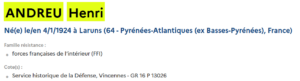Andreu Henri est né le 4 janvier 1924 à Laruns. Il s’implique dans la résistance dès l’hiver 1940 – 1941.