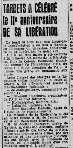 Le 8 octobre 1944, le maire de Tardets (Dr Jaureguy) et les responsables militaires locaux (Capitaines de Jaureguiberry et Hegoburu) signent un document en reconnaissance aux actions de Mme Danielle Sagardoy pendant l’occupation allemande et lors de la libération de Tardets.